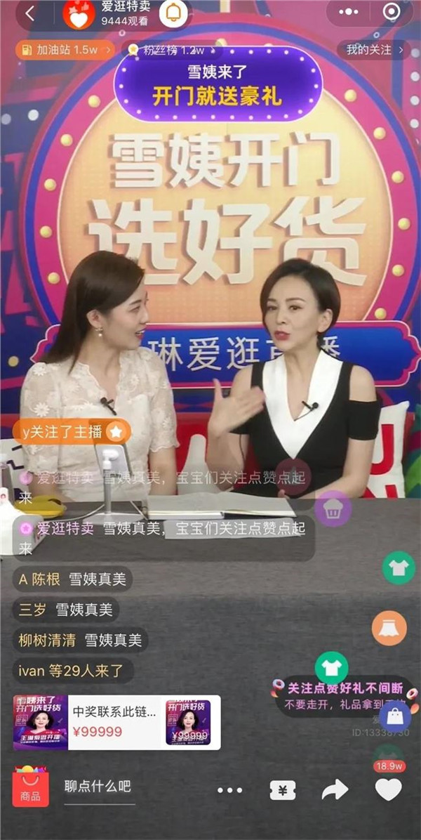 7 月 4 月,雪姨王琳加入了爱逛直播进行电商首秀,开启了一场名为《开门选好货》的直播活动。在王琳首先开播的同时,罗蒙、张芳甄选、丹姿水密码、金猴、EITIE(爱特爱)和伍亩田 6 个商家分别开播,雪姨亲自为这些商家们推荐和宣传。