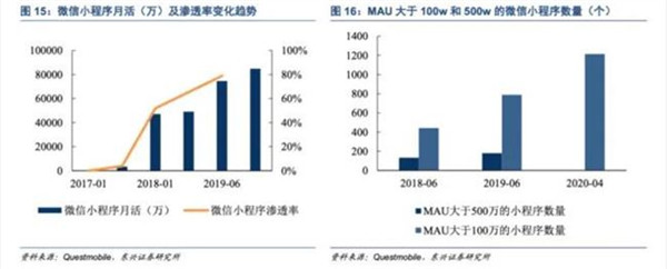 根据第三方数据,截至 2020 年 4 月,微信小程序月活 8.49 亿,渗透率超过 70%,MAU 大于 100 万的 小程序达到 1214 个。2019 年人均小程序访问次数同比提升 45%, 人均使用小程序个数同比提升 98%。